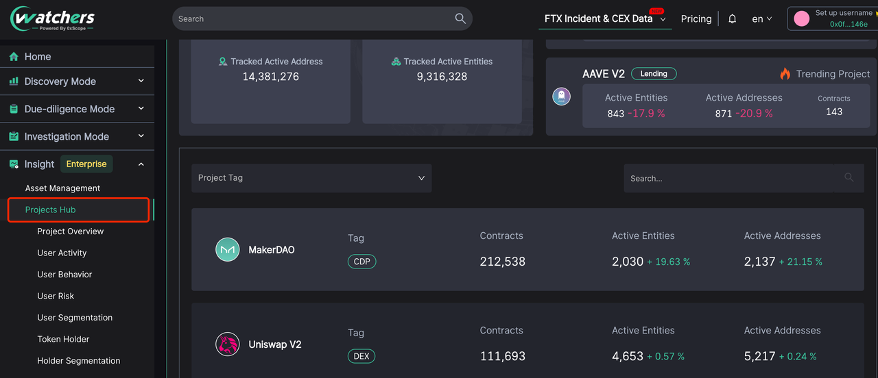 Project Hub aims to provide in-depth web 3 project analytics based on Ethereum（Multichains soon）data, especially user data. On the Main Page, you can explore the interactive project report of more than 680 Ethereum projects. The user profile analytics and many other powerful tools will help you with your business and investment. With Scopescan Insight, everyone will be able to: